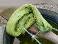 Jetzt konnte mit dem Färben begonnen werden. Bei dem Garn handelte es sich um ein Gemisch aus Baumwolle und Kapok (Kapok wird auch Pflanzendaunen genannt und ist die Hohlfaser des Kapokbaumes - die leichteste natürliche Hohlfaser). Schon nach kurzer Zeit zeigte sich das erste blaue Garn für die BUGA - gefärbt wurden 6 Stränge zu je 50 Gramm.