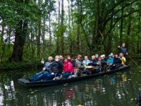 Auf dem Spreewasser fuhren wir durch die herrliche Natur des Spreewaldes, vorbei an der Liebesinsel, romantischen Häusern und Hütten, an vom Biber angenagten Bäumen und weidenden Rindern. Da hatte ein Künstler einen großen Löffel ins Wasser der Spree getunkt, um damit zu verdeutlichen, dass wir die Suppe auslöffeln müssen, die wir der Natur antun. Ein Stück weiter stand eine scheinbar alte Hütte, die jedoch neueren Datums war und eine Rolle als Requisite in einem Spreewaldkrimi gespielt hatte. Zwischendurch gab es vom Kahnfahrer diverse Schnäpschen oder auch Bier zum Aufwärmen. Dadurch wurde die Stimmung von Minute zu Minute lustiger.