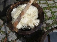 Wolle war bereits eingeweicht worden, wurde kurz ausgewrungen und landete vorsichtig im Färbetopf. Neugierig wurde das Schauspiel von den Gästen verfolgt. Nach einigen Minuten im Farbbad wurde der Strang herausgeholt und zeigte den Farbumschlag, sobald Sauerstoff auf Indigo trifft. Von oben nach unten färbte sich die Wolle von hellgelb in blau - was für ein herrlicher Anblick! Nachdem man die Wolle ausgewrungen hat geht der Farbumschlag noch schneller vonstatten.