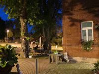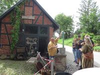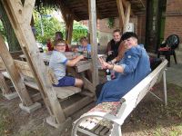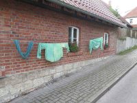Da der Bürgerhaus-Hof aus Sicherheitsgründen abgesperrt war, verlagerten wir den Färbetag unter die beiden Kastanien vor dem Bürgerhaus an der Minzebank. Die Gäste waren 14.00 Uhr eingetroffen, wie auch einige Einwohner von Hochstedt, die dem Bratwurstduft nicht widerstehen konnten. Es gab auch Kaffee und sogar ein Stück Kuchen. Bei milder Witterung und trockenem Himmel konnte die Färberei beginnen.