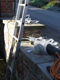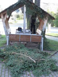Die Vorbereitung des Ereignisses fanden jedoch schon früher statt, da rings um das Bürgerhaus noch geschmückt und dekoriert werden sollte - nicht zuletzt im Museum. Dort, in der Holztruhe ruhen über das Jahr die Weihnachtsschätze, wie der Baum und die Lichterketten. Ab 10.00 Uhr ging es ans Werk. Im Museum wurde die Truhe geöffnet und die Utensilien nach unten gebracht, um sie aufzustellen. Draußen wurde die Minze, die seit dem Frühjahr unter dem Dach der Minzebank angebracht war abgenommen und durch Lichterketten und Tannengrün ersetzt.