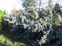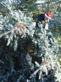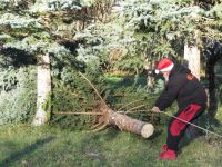Die Blautanne, die der Weihnachtsbaum werden sollte stellte sich als Zwillingsbaum dar - hatte also zwei Spitzen, die sich bereits weit unten am Stamm gabelten. Um den mächtigen Baum erst einmal auf die Straße zu bekommen, mussten die Weihnachtsbaumwichtel vom Traktor unterstützt werden.
