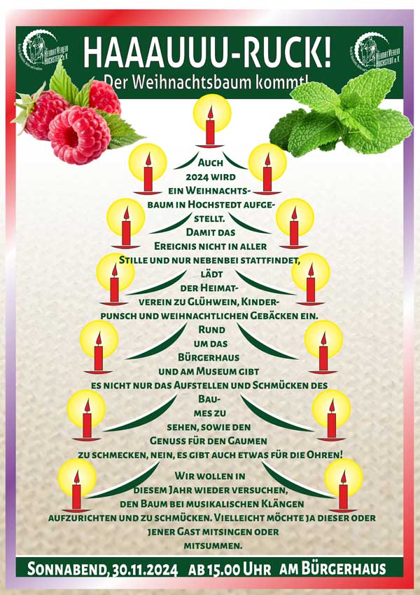 Wie in jedem Jahr wurde am Vorabend zum 1. Advent der Hochstedter Weihnachtsbaum aufgestellt und geschmückt - diesmal also am 30. November ab 15.00 Uhr am Bürgerhaus in Hochstedt, bei frostigen Temperaturen.