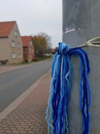 Auch die Mitglieder vom Heimatverein beteiligten sich an der großen Baumpflanzaktion der Sommerschule der LEG mit einem Beitrag. Am Morgen des zweiten Tages, am sonnigen aber kalten 9. November 2024, galt es zunächst den Weg zum Museum zu markieren. Hierfür waren blaue (was sonst?) Wollfäden vorgesehen, die an Laternenmasten, Geländern, Bäumchen und an der Minzebank befestigt wurden. Am zentralen Pflanzort, hinter dem Sportplatz, standen die kleinen Bäumchen bereit und man konnte den Arbeitsstand vom Vortag sehen, wo die Aktion bereits abgeschlossen war. Heute würden Lückenbepflanzungen vorgenommen.