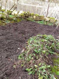 Die Pflanzen wurden auf einer Seite des Beetes aufgetürmt, um sie dann besser entsorgen zu können. Dabei stellte sich heraus, dass ziemlich viel roter Klee mit im Beet steckte, der dort natürlich nicht wachsen sollte.