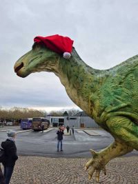 Zur Nikolausfahrt am 6. Dezember 2025 nach Kassel hatten sich knapp 40 Mitreisende angemeldet. Leider spielte das Wetter ausgerechnet an diesem Tag nicht ganz mit – zumindest war es jedoch (zuerst) trocken. Um 9.00 Uhr starteten wir in westlicher Richtung und hatten, wie geplant, gegen 11.00 Uhr den Busparkplatz für Reisebusse, ganz im Zentrum von Kassel am Naturkundemuseum erreicht. Hier begrüßte uns ein Dinosaurier mit Weihnachtsmannmütze.