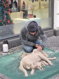 Das machte jedoch nichts, denn gegen die kühle Luft gab es überall herrlich duftende glühende „Mittel“, um sich von innen zu erwärmen zwischen Rathaus, dem Friedrichs- und dem Königsplatz. Dort befanden sich neue geschaffene Plätze und Wege mit Namen wie Dornröschengasse, Sterntalerplatz, Schneewittchenallee, 7-Zwerge-Gasse oder auch den Frau-Holle-Platz. Sogar Straßenkünstler waren anzutreffen. Einer von ihnen modellierte aus Sand Hunde.