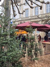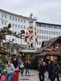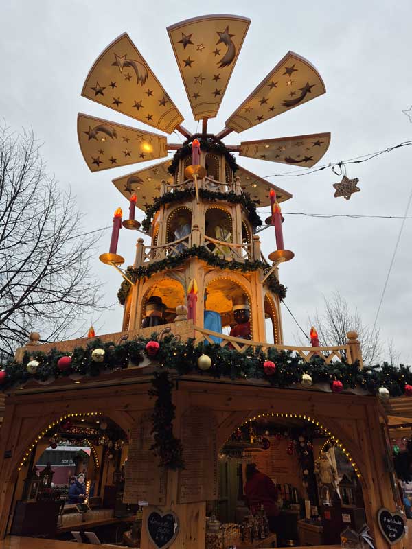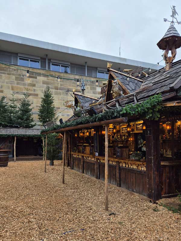 Von hier war es nicht mehr weit zum Weihnachtsmarkt, wo viele geschmückte Weihnachtsbuden aufgestellt waren und auf die Besucher warteten. Auch hier in Hessen war der Tag eher trüb und die Sonne der Vortage hatte sich hinter den Wolken versteckt.