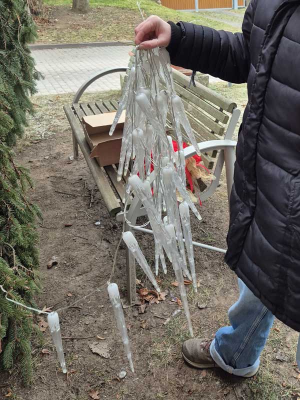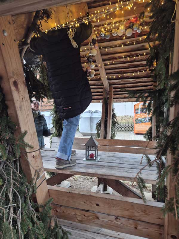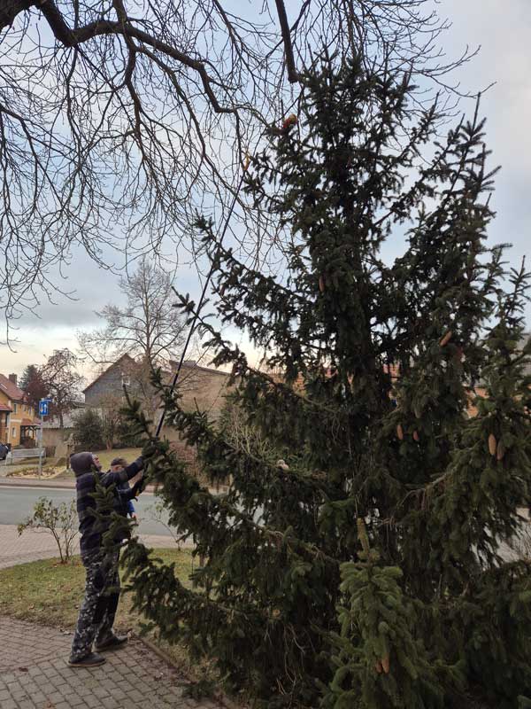 Der Hochstedter Weihnachtsbaum wurde am 23. Januar abgeschmückt. Es war an der Zeit endlich die weihnachtlichen Lichter vom Weihnachtsbaum herunter zu angeln und natürlich auch die Kugeln. Gleich daneben war auch die Minzebank mitten im Geschehen, denn die leuchtenden Eiszapfen sollten nun auch verstaut werden.