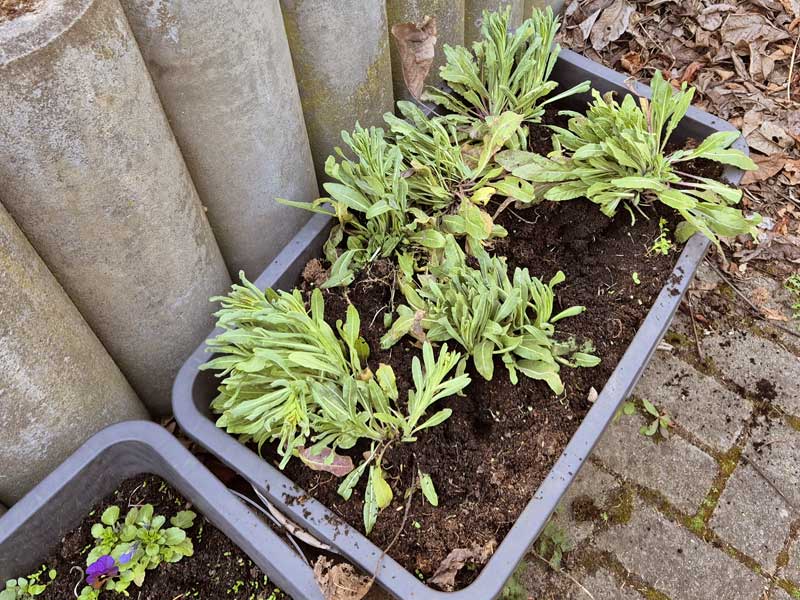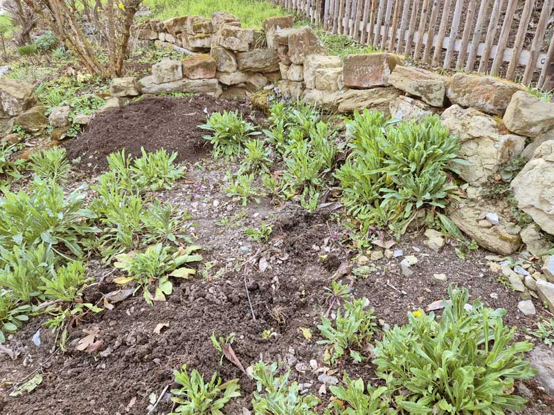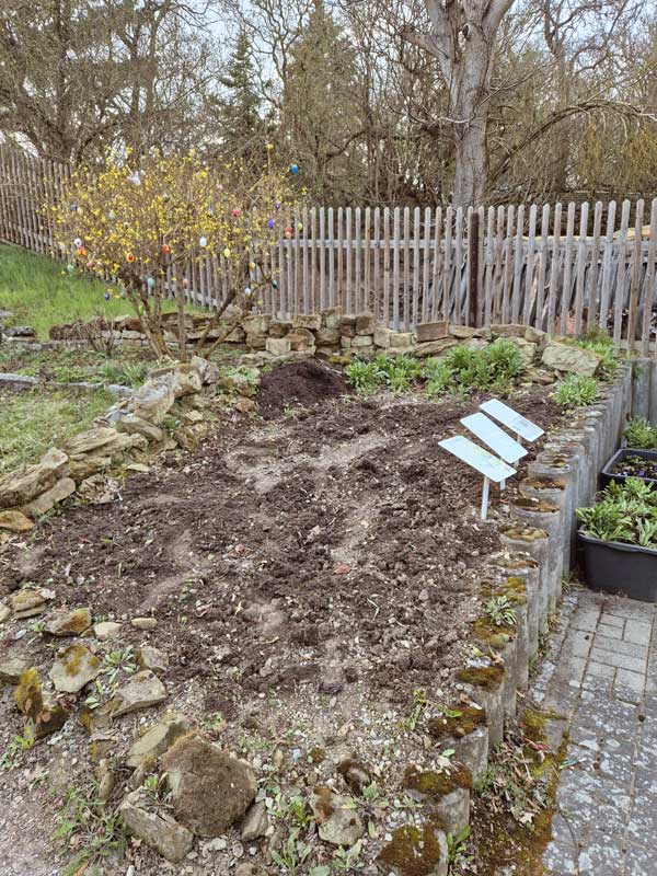 Das Waidbeet wurde in diesem Jahr ziemlich spät in Angriff genommen. Es hatte bereits viele milde Tage gegeben und der Waid vom letzten Jahr begann bereits seinen Blütenstängel auszutreiben. Es war also höchste Zeit für das Umsetzen der Waidpflanzen, wenn man sie nicht entsorgen wollte. Wie immer sollte ein Teil der Pflanzen auf dem Beet zur Blüte kommen und Samen ausbilden. Dafür waren die Waidpflanzen am Rande des Beetes gedacht. Die anderen wurden in Kübel umgesetzt und am Waidstein eingetopft, wo sie blühen sollten. Es ging also am 20. März 2026 (Frühlingsanfang) an die Arbeit und damit an das Ausgraben der Pflanzen damit später umgegraben und neu ausgesät werden konnte.