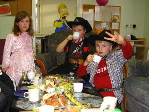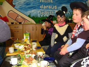 Auch im Freizeittreff wurde Fasching gefeiert. Welchen Tag konnte man sich schon besser dafür aussuchen, als den Rosenmontag? Zahlreiche Prinzessinnen, Seeräuber, Westernhelden, Mäuse und andere Gestalten und Tiere hatten sich versammelt, um Fastnachtskräppel gemeinsam zu vertilgen, zu spielen und Lieder zu singen