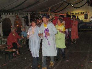 Dabei fasste er die Ereignisse der Kirmes 2008 zusammen. Es kamen auch Begebenheiten zur Sprache, die hinter den Kulissen beobachtet worden waren und den Kirmesvater selbst betrafen (und ihn selbst im Kerzenschein erröten ließen).