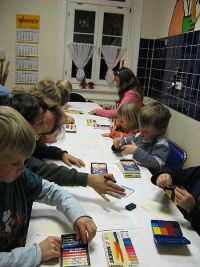 Oben, im Freizeittreff war alles zum Bemalen der Kalenderblätter vorbereitet und die Knirpse machten sich sogleich an die Arbeit. Schnell füllte sich Blatt für Blatt. Unter jedes Kunstwerk wurde der Name des Kindes geschrieben und damit kenntlich gemacht, wer da gemalt hat.