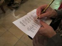 Die Pastorin verteilte Stifte und die Mitglieder der Kirmesgesellschaft begannen damit, diese Attribute jeweils farblich hervorzuheben.