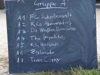 Der Sonntag stand wie immer unter dem Zeichen des Jedermann-Turniers. Bei schönem Wetter - im Gegensatz zum Vortag - hatten sich vierzehn illustre Mann- und MannFrauschaften zusammengefunden die unter den lustigsten Namen das Turnier austrugen. Am Ende siegte die Mannschaft mit dem Namen "Aston Vanilla FC" und gewann drei Fässchen Bier.