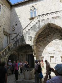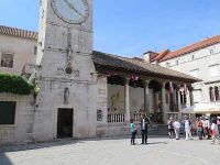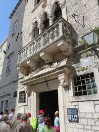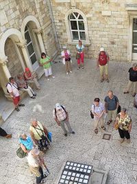 Um 9.35 Uhr hatten wir den Treffpunkt mit der Stadtführerin in Trogir erreicht. Nur wenig später begann die Stadtführung auf der städtisch bebauten Insel. Vor einem alten Stadttor erklärte die Gästeführerin wo die nächsten Toiletten zu finden wären, bevor wir durch das Tor die Stadt betraten.