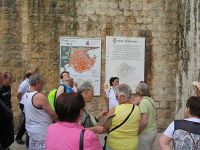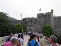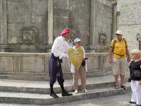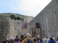 Daniela hieß unsere Stadtführerin für Dubrovnik. Wir betraten die Stadt über das Stadttor - dem Pile-Tor, mit dem Stadtpatron über dem Portal, St. Blasius - zur Landseite hin. In vergangener Zeit gab es dort eine Zugbrücke. Sie war dafür da, Feinde abzuhalten, die Stadt zu betreten. Durch das Tor ging es praktisch durch die äußere Stadtmauer über eine Rampe hinunter zum inneren Stadttor. Zwischen beiden Toren waren Stadtpläne angebracht. Der rechte zeigte die Treffer beim Beschuss Dubrovniks während des Angriffs der Jugoslawischen Bundesarmee und serbisch-montenegrinischer Truppen im Jahr 1991.