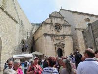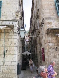 Auf der anderen Seite lehnt sich die Erlöserkapelle, Sveti Spas, an die Stadtmauer. Von hier ging es den Stradun entlang. Rechts und links führten enge Gässchen zwischen hohen mittelalterlichen Gebäuden hindurch. Im oberen Teil hing zumeist Wäsche quer über den Spalt der Gasse. Auf der Bergseite waren im hinteren Teil der Gassen Stufen zu erkennen. Fahrzeuge gab es hier sowieso nicht, also konnte man seine Beine auch zum Treppensteigen benutzen. Jedoch eine Tageszeit schien eine Ausnahme mit dem Fahrzeugverbot darzustellen: der frühe Vormittag. Zu dieser Zeit waren wir hier unterwegs. Post- und kleine Müllfahrzeuge waren auf dem alten Pflaster, genauso wie Lieferwagen.