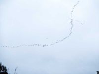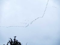 Am 17. Oktober kündigte lautes Geschrei am Himmel den jährlichen Herbst-Zug der großen Vögel an. Kraniche und auch Gänse fliegen in dieser Jahreszeit in V-Formationen in ihre Winterquartiere. Ob es sich dabei um Kraniche oder Gänse handelt, lässt sich nicht immer so einfach zuordnen. Das Flugbild der Kraniche zeigt beim Einzeltier den langen Hals, eher eckig geformte Flügelenden durch die gespreizten Handfedern, sowie langgestreckte und über den Schwanz hinausragende Beine. Bei der Gans erkennt man den langen Hals, spitz zulaufende Flügel und nur den kurzen Schwanz. Bei den Formationen am 17. Oktober 2020 handelte es sich um Kraniche.