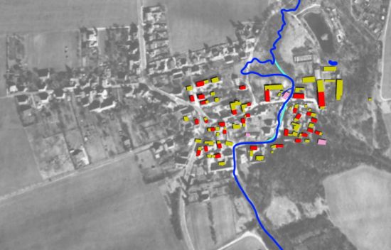 Öffentliche Gebäude (rosa): rechts - Kirche, mitte - Brauhaus (heute Feuerwehr-Gerätehaus), links - Backhaus