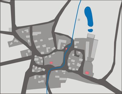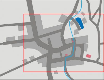 Ortsplan von 2005 - die rote Linie markiert den Kartenausschnitt von 1873 der oberen Karte