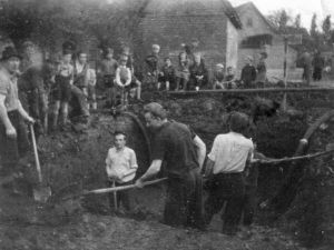 Am Teich v.l.n.r: Bernhard Schüßler (Ortsbrandmeister), Wolfgang Peetz, Hubert Koblitz (vorn) Otto Schüßler, Wilhelm Schaubs, Hans Franke (vorn), Werner Heiter, Paul Kairis