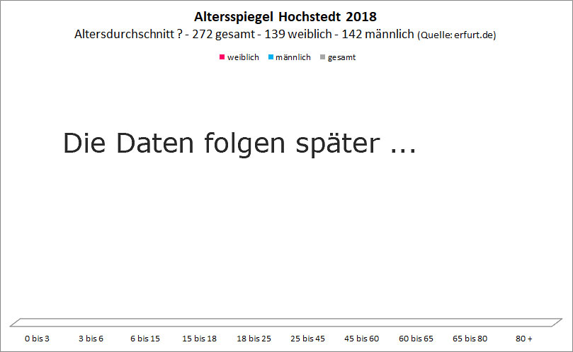 Das folgende Diagramm gibt eine Übersicht über die Altersstruktur der Hochstedter Einwohner im Jahr 2018. Der Stichtag für die Ermittlung der Daten war der letzte Tag des Jahres, also der 31.12.2018.