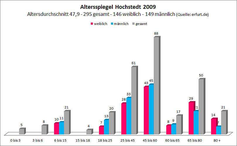 Das folgende Diagramm gibt eine Übersicht über die Altersstruktur der Hochstedter Einwohner im Jahr 2009. Der Stichtag für die Ermittlung der Daten war der letzte Tag des Jahres, also der 31.12.2009.